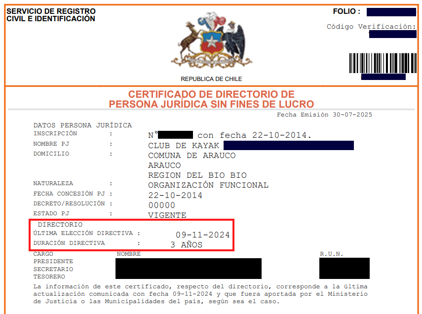 En el siguiente Certificado de Directorio la última elección de directiva se realizó el 09-11-2024 y la duración de directiva es de 3 años. Por lo tanto, si sumamos la duración de la directiva a la fecha de la última elección de directiva obtenemos que la fecha de vencimiento corresponde al 09-11-2027.